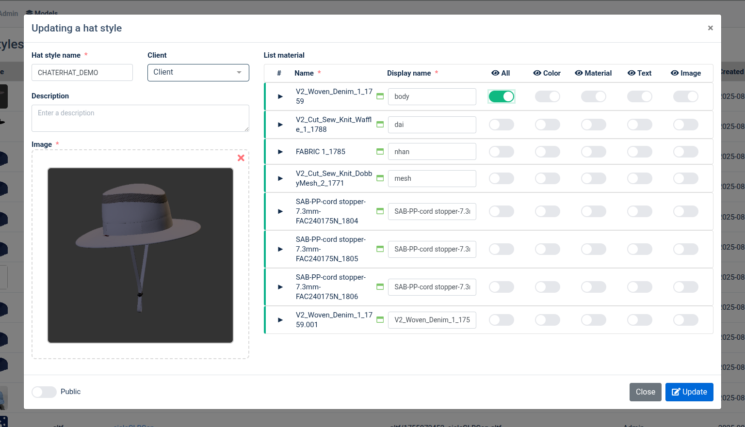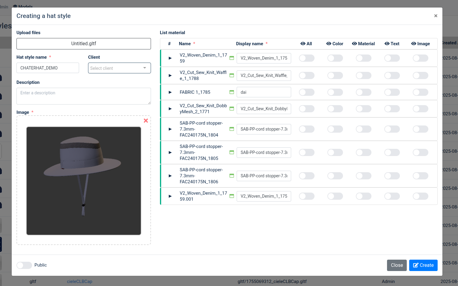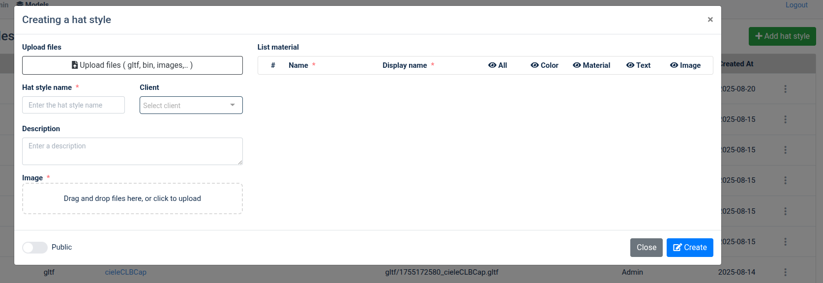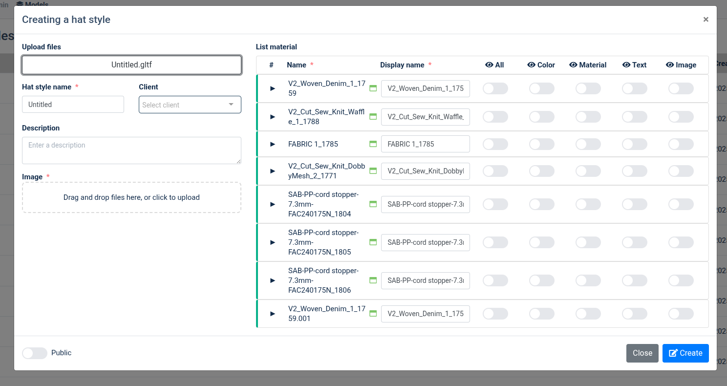 + Hat style name*: tên mẫu nón + Client: lưu mẫu nón với client chọn hoặc k chọn mặc đinh lưu vô admin + Description: note + Image*: Chỉ hỗ trợ file .png hoặc .jbg + Button toggle public: public mẫu nón -
