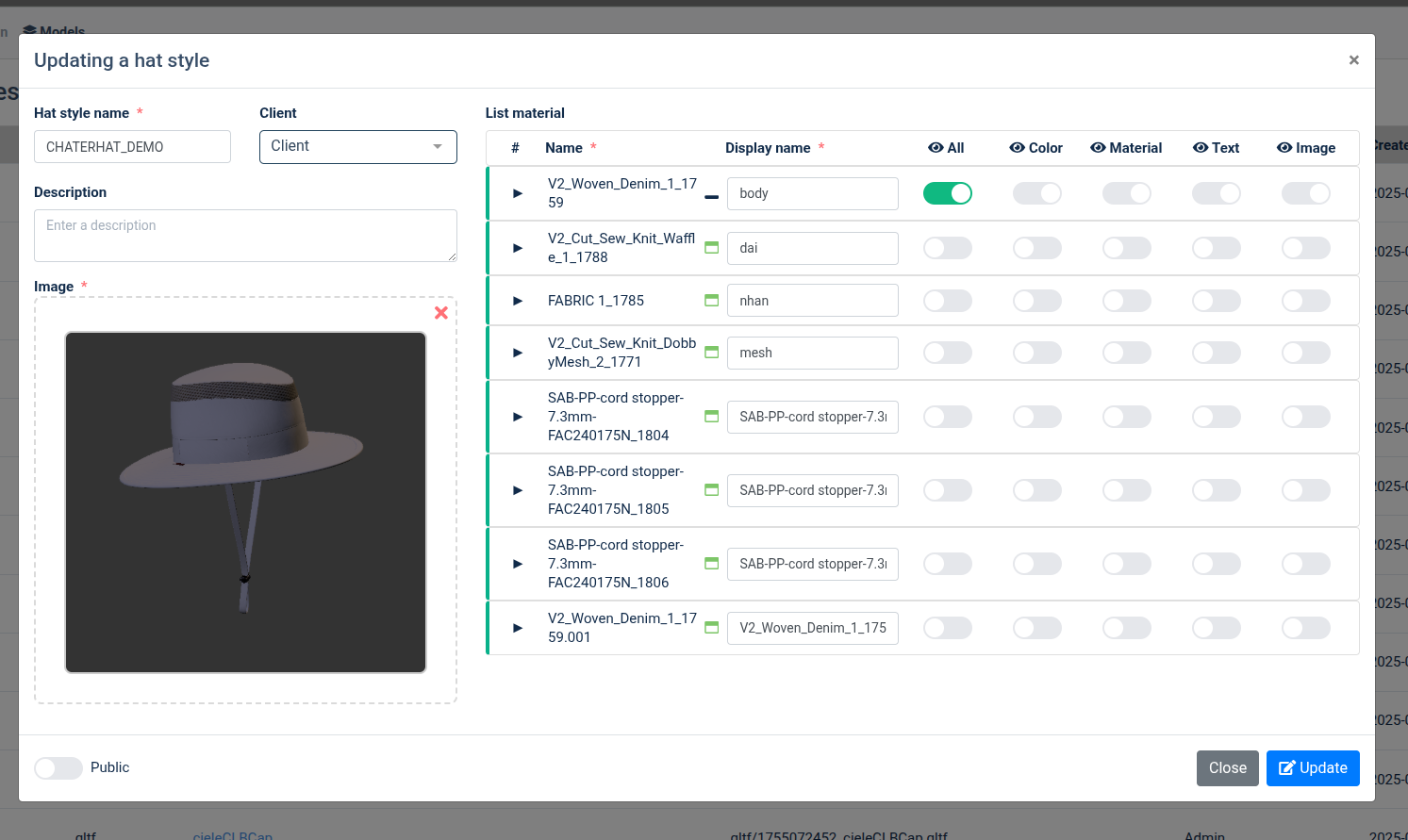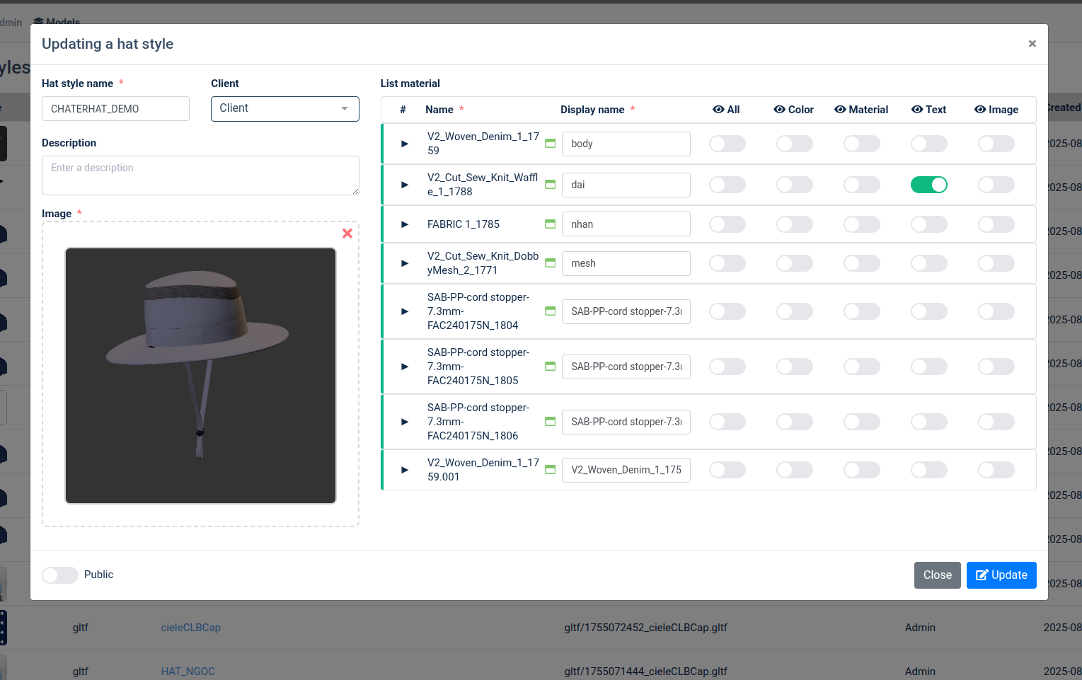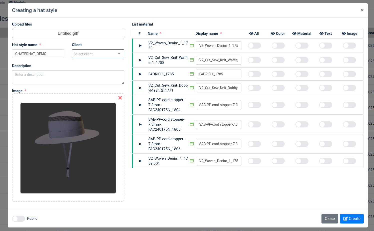 + Hat style name*: tên mẫu nón + Client: lưu mẫu nón với client chọn hoặc k chọn mặc đinh lưu vô admin + Description: note + Image*: Chỉ hỗ trợ file .png hoặc .jbg + Button toggle public: public mẫu nón -