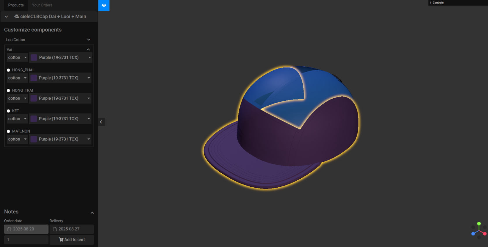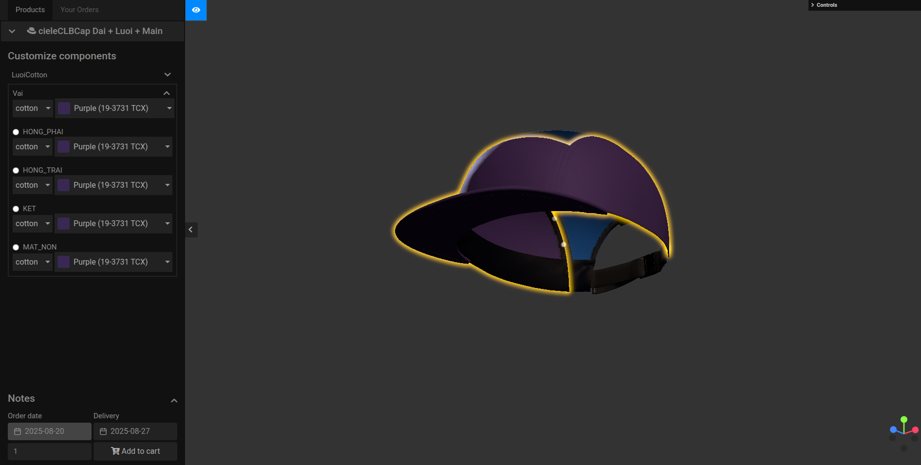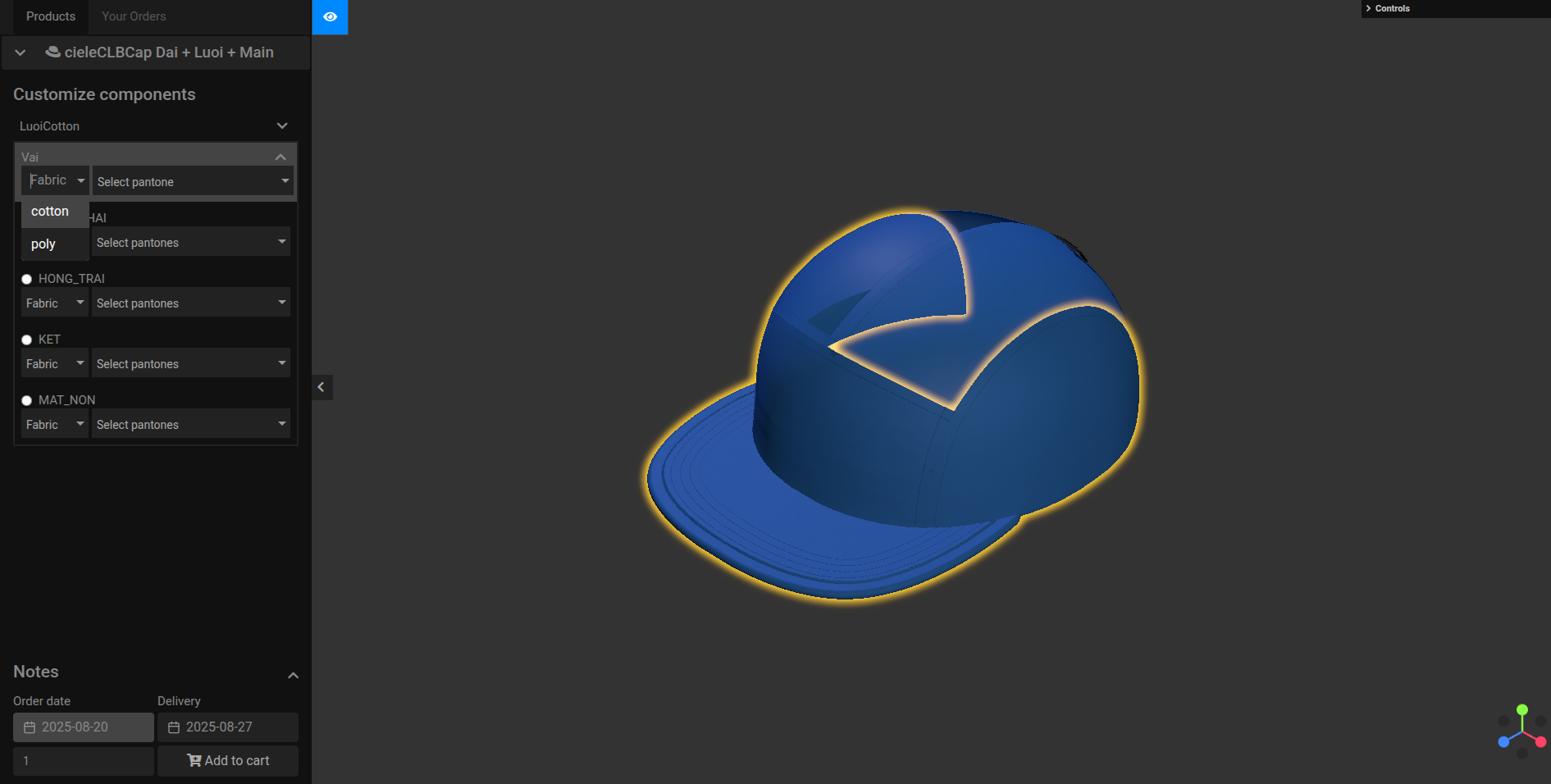 - Note: Bật Material trong setting mẫu nón chỉnh ( theo yêu cầu edit màu vải của material)