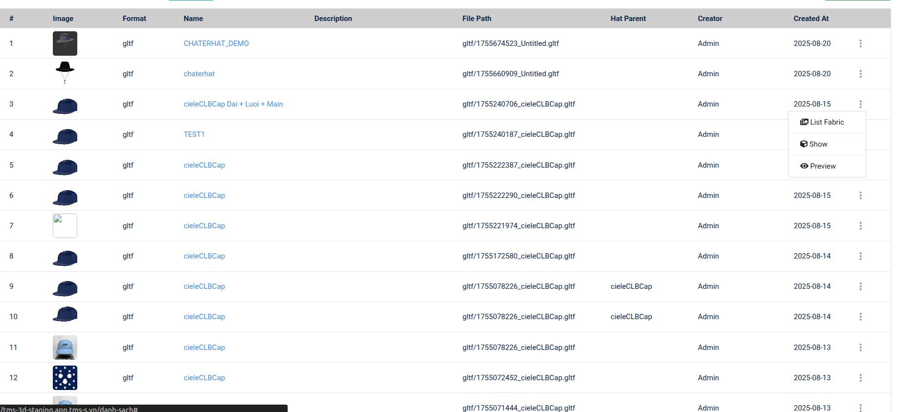 Bước 1: Click 3 chấm ở mẫu nón muốn import vải màu -> click "List Fabric" -> mở modal import Fabric
