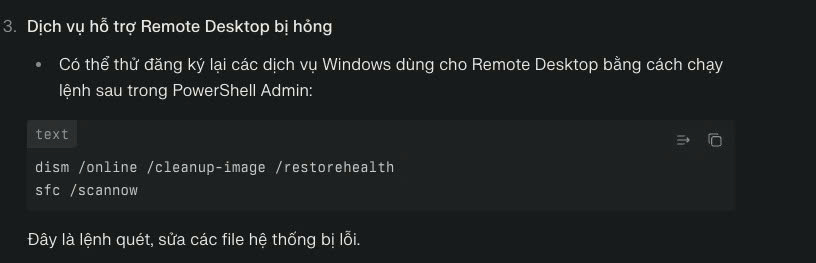 Có thể thử đăng ký lại các dịch vụ Windows dùng cho Remote Desktop bằng cách chạy lệnh sau trong PowerShell Admin: