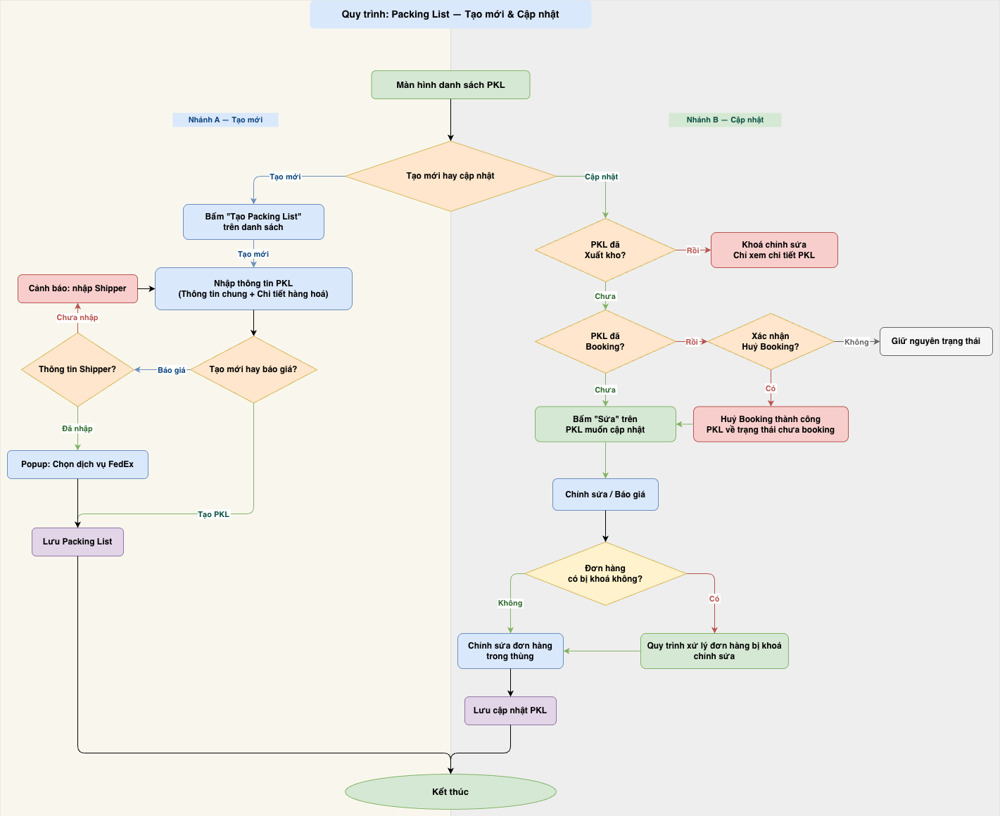 🔒 Khóa toàn bộ Packing List cho khách hàng Khi đã xuất kho hoặc ngay sau khi nhấn "Báo giá", chọn gói cước và xác nhận book ship thành công với FedEx (hệ thống sinh mã Tracking), toàn bộ dữ liệu của Packing List cho khách hàng sẽ bị khóa cứng, không cho phép chỉnh sửa bất kỳ thông tin nào nữa.