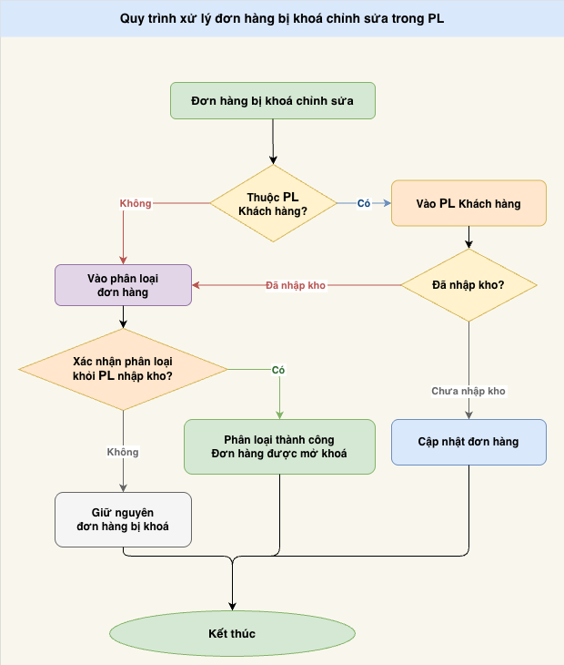Trạng thái Quyền chỉnh sửa Chưa nhập kho Chỉnh sửa toàn bộ Đã nhập kho / phân loại Chỉ được thêm đơn hàng mới, không sửa đơn hàng cũ Đã xuất kho hoặc đã book ship Không được phép chỉnh sửa
